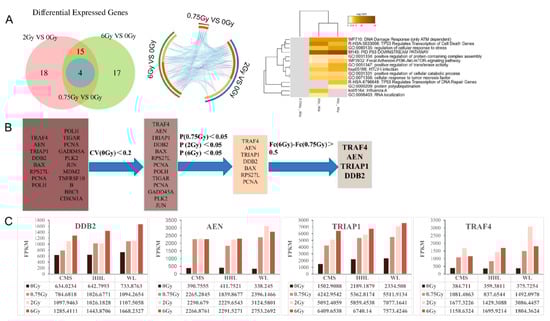 Analysis of differentially expressed genes in human peripheral blood 2 h after γ-ray irradiation. (A) Overlap analysis was performed on differentially expressed genes in 2 h after different doses of irradiation. Functional annotation analysis were performed on these differentially expressed genes. On the outside, each arc represents the identity of each gene list, each deep orange arc inside the diagram represents a gene that appears in multiple lists, and the light orange arc represents a single gene in that list. The purple line connects differentially expressed genes that were common to the different dose groups and the blue line connects differentially expressed genes enriched in the same GO term. All statistically enriched were hierarchically clustered into a tree and 0.3 kappa score was applied as the threshold to cast the tree into term clusters; the heatmap cells are colored by their p-values, white cells indicate the lack of enrichment for that term in the corresponding gene list. (B) Screening procedures for candidate biomarkers. Among the 17 genes associated with P53, the genes whose coefficient of variation (CV) > 2 and Fold Change (FC) in 0.75 Gy, 2 Gy and 6 Gy is not significant compared to 0 Gy were eliminated. Finally, we selected four genes whose ratio of maximum to minimum of Fold Change in 0.75 Gy, 2 Gy, and 6 Gy was greater than 0.5. (C) Expression levels of P53 related candidate genes in human peripheral blood before and after different doses of irradiation.