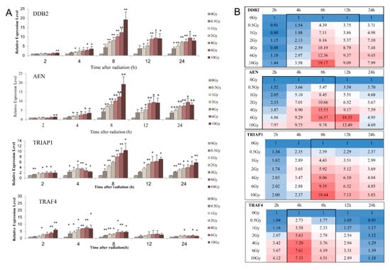 Analysis on time and dose effects of radiation sensitive genes. (A) The histogram shows the time effect and dose effect of DDB2, AEN, TRIAP1, and TRAF4 after irradiation; * p < 0.05, ** p < 0.01. (B) The heat map shows the response time window and change pattern of DDB2, AEN, TRIAP1, and TRAF4 after exposure to ionizing radiation. Cells are colored by their fold changes, black windows frame the time range of the genes response to radiation dose.