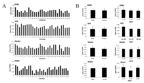 Baseline level analysis of DDB2, AEN, TRIAP1, and TRAF4 in healthy population (A) Collected the venous blood from 29 healthy volunteers (age ranging from 20 to 50 years old, male: 15 and female: 14), and analyzed the expression levels of DDB2, AEN, TRIAP1, and TRAF4. (B) The effects of gender and age on DDB2, AEN, TRIAP1, and TRAF4 gene expression were analyzed (* p < 0.05).