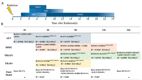 Multiple genes were combined to form a final model to assess the doses of ionizing radiation (A) Model of DDB2, AEN, TRIAP1 and TRAF4 response time to ionizing radiation. (B) The dose estimation equation was fitted for each gene within the dose range with significant dose dependence at its respective time point, which was taken as a new independent variable to fit the final dose estimation equation by PLS algorithm.