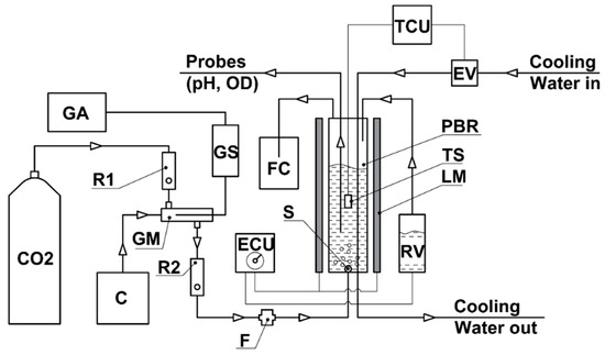 Principal working scheme of the experimental unit. CO2—carbon dioxide cylinder; GA—gas analyzer; C—air compressor; R1—CO2 rotameter; R2—gas-air mixture rotametr; F—filter; GS—gas analyzer sensor; FC—foam container; GM—gas-air mixer; ECU—electric control unit; TCU—temperature control unit; EV—electromagnetic valve; PBR—photobioreactor; S—gas-air mixture sprayer; RV—reserve water (medium) volume; TS—temperature sensor; LM—LED modules; OD—optical density; pH—hydrogen ion exponent.