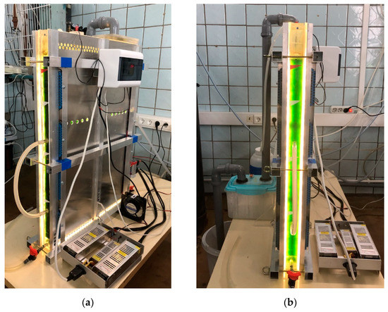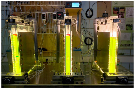 The PBR, with a working volume of 5 L, consists of a glass aquarium with an internal volume of 361 mm × 40 mm × 460 mm, submersible module with cooling and hot water supply systems, and two LED modules, consisting of 18 rows of LED strips (Figure S1). The average irradiance on the light-receiving surface of the PBR was 900 µmol m−2 s−1. Modules were installed close to the sides of the reactor. Three PBRs (of this construction type) have been used in the current work. Figure 2 presents a photo of the reactors. The operation of PBR FP-5 is demonstrated in Video S1.