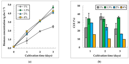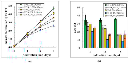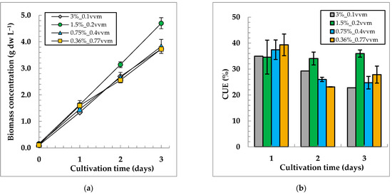 Figure 4a shows that the variants with 1.5%, 2%, and 4% CO2 turned out to be almost identical in terms of biomass accumulation, while the variant with 1% CO2 had the worst growth. On the third day of cultivation, the reliable differences in the biomass concentration became visible in the variant with 1.5% CO2. In the culture grown at 1.5% CO2, the CUE (35 ± 2% and Psp of 1.51 ± 0.07 g dw L−1 d−1) was higher than that for other variants (Figure 4b, Table S2). Therefore, for further investigation, we chose the value of RCO2 = 0.003 vvm, which corresponds to 1.5% CO2 at 0.2 vvm.