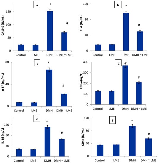 Effect of colon cancer and colon cancer-LME treated rats on serum level of (a) CA19.9, (b) CEA, (c) AFP, (d) TNF-α, (e) IL-1β, (f) CD4+, as well as (g) DNA fragmentation percentage. Symbol (*) is significantly different from the control group; symbol (#) is significantly different from DMH group at p ≤ 0.05 level; DMH is dimethylhydrazine; LME is Litophyton sp. methanolic extract.