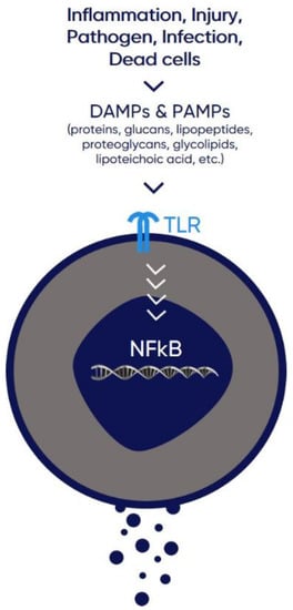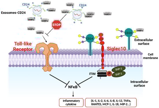 Exosomes carrying CD24, named EXO-CD24, combine advantages of both exosomes as a novel drug delivery platform and CD24 as a potent immune checkpoint surveillance molecule. CD24 interacts with both DAMPs and Siglec 10. CD24’s link to DAMPs prevents them from binding to the TLRs, therefore inhibiting the NF-ĸB pathway that induces the production of cytokines and chemokines. At the same time, the CD24-Siglec 10 axis negatively regulates the activity of NF-ĸB through ITIM domains associated with SHP-1. While CD24 interacts with DAMPs and Siglec 10, it does not affect immune recognition through PAMPs, thereby allowing the innate immune response to achieve viral clearance. CD24, Cluster of differentiation 24; DAMPs, damage-associated molecular patterns; ITIM, immunoreceptor tyrosine-based inhibition motif; NF-κΒ, nuclear factor-κΒ; PAMPs, pathogen-associated molecular patterns; Siglec 10, sialic acid binding immunoglobulin-like lectin 10; SHP-1, SRC homology 2-domain-containing protein tyrosine phosphatase 1; TLR, Toll-like receptor. Created with BioRender.com (accessed on 7 September 2022).