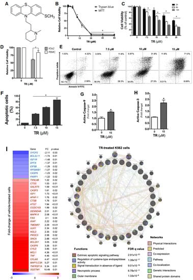 Figure 1. TR Induces Cell Death Selectively in Leukemia Cells. (A) Chemical structure of thioridazine (TR). (B) Viability of K562 cells in the presence of 0–60 µM TR incubated for 24 h using MTT reduction (empty circles) and trypan blue exclusion assays (full circles). (C) Viability of K562 cells in the presence of 0–20 µM TR incubated for 2 h (black bars), 6 h (white bars), and 12 h (grey bars) evaluated by MTT reduction assay. (D) Viability of K562 cells (grey bars) and PBMCs (white bars) treated with 15 µM TR for 24 h, assayed by MTT. In (AC), data are expressed as percentages of viable cells (mean ± SD) calculated about control (i.e., without TR), considered to be 100%. (E) Representative flow cytometry dot plot of annexin V-FITC/PI doubled-stained in K562 cells incubated for 24 h with 15 µM TR. The number in each quadrant is the percentage of events. (F) Quantification of apoptotic annexin-V-positive cells (lower and upper right quadrants); data are expressed as percentages of apoptotic cells (mean ± SD). (G) The activity of caspase-9 in K562 cells incubated with 15 µM TR for 24 h determined spectrophotometrically. (H) Active caspase-3 in K562 cells upon incubation with 15 µM TR for 24 h by flow cytometry using a monoclonal antibody. Caspase-9 and -3 are expressed as fold changes (mean ± SD) about control. (I) Gene expression heatmap from qPCR array analysis of K562 treated with vehicle or 15 μM TR for 6 h. The mRNA levels were normalized to those of vehicle-treated K562 cells and calculated as fold changes in expression; genes with their expression significantly modulated in either direction are included in the heatmap. Network analysis for genes modulated by TR was constructed using the GeneMANIA database (https://genemania.org/, accessed on 29 June 2022). The upregulated and downregulated genes in the PCR array are illustrated as crosshatched circles, and the interacting genes included by the software modeling are indicated by circles without crosshatches. The main interactions between genes are indicated by colored lines and the five main cellular processes are described in the Figure. The p and FDR q values are indicated. (J) Modulation of the expression of Bcl-2 family proteins by TR (10 and 15 µM) incubated for 6, 12, and 24 h with K562 cells. Cells cultivated for 24 h in the absence of TR were used as control, and no significant differences were observed compared to 6 and 12 h (not shown). (K) Densitometry bands were quantified and normalized by their respective β-actin bands. Values are expressed as means ± SD. * Statistically different (p < 0.05).
