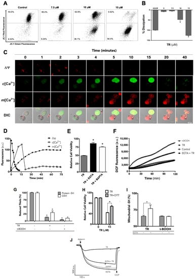 Figure 2. Increased Cytosolic Ca2+ Levels Induced by TR Result in Thiol Oxidation and Mitochondrial Permeabilization Associated with Cell Death. (A) Mitochondrial membrane potential (∆Ψ) of K562 cells incubated with TR (7.5, 10, and 15 µM) for 24 h was evaluated by flow cytometry using the JC-1 dye. Uncoupler CCCP was used as a positive control. (B) Quantification of the percentage of the dissipation of ΔΨ considering all replicates. Data are expressed as percentages of dissipation (mean ± SD). * Statistically different from the control (p < 0.05). (C) Representative images of the temporal evaluation of effects of 15 µM TR on ∆Ψ and both cytosolic and mitochondrial Ca2+ levels. K562 cells were loaded with rhod-2/AM (red) and fluo-3/AM (green) for simultaneous Ca2+ measurement by confocal microscopy. (D) Effect of 2.5 mM EGTA or 10 µM BAPTA-AM on the cytotoxicity of 15 µM TR incubated for 24 h with K562 cells. Data are expressed as percentages of control, considered to be 100% (mean ± SD). * Statistically different from TR (p < 0.05). (E) Representative traces of the effect of 2.5 mM EGTA on the TR-induced ΔΨ dissipation in digitonin-permeabilized K562 cells loaded with rhodamine 123. (F) Control (open circles), 15 µM TR (filled circles), 2.5 mM EGTA plus 15 µM TR (filled squares), and 2.0 mM t-BOOH (filled squares) were added to K562 cell suspension, and changes in the DCF fluorescence were recorded in real time. (G) Oxidation of reduced thiol groups of proteins (gray bars) and glutathione (white bars) by 15 µM TR in K562 cells after 24 h of incubation. t-BOOH was used as a positive control. * Statistically different from the control (p < 0.05). (H) Effect of 1.0 mM DTT on the cytotoxicity of 15 µM TR in K562 cells after 24 h of incubation. (I) Effect of 2.5 mM EGTA on the oxidation of reduced thiol groups of mitochondrial proteins induced by 15 µM TR or 2.0 mM t-BOOH after 24 h of incubation. (J) Impairment of the establishment of ∆Ψ by 15 µM TR in succinate-energized digitonin-permeabilized K562 cells and the protective effect of 2.5 mM EGTA.
