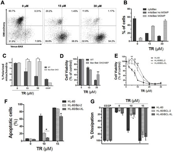 Figure 3. Mitochondrial Permeabilization in TR-Induced Cell Death and the Role of Bcl-2 Proteins. (A) Representative flow cytometry fluorescence dot plot of HeLa cells stably expressing Omi-mCherry and BAX-Venus incubated with 15 or 30 µM TR for 24 h. (B) Quantification of the decrease of Omi-mCherry and increase of BAX-Venus fluorescence indicating BAX translocation from the cytosol to the mitochondria resulting in MOMP, concomitant to the release of Omi/HtrA2 from the mitochondria to the cytosol during the apoptotic process. Effects of TR on ∆Ψ (C) and cell viability (D) of WT and Bax−/−Bak−/− DKO MEFs after 24 h of incubation evaluated with TMRM and MTT, respectively. CCCP was used as a positive control. Data are expressed as percentages of viable cells (mean ± SD) calculated considering the control (i.e., without TR) as 100%. * Statistically different from WT cells (p < 0.05) (E) Effect of TR on the viability of HL60 human leukemia cells overexpressing BCL-2 or BCL-xL compared with WT HL60 after 24 h of incubation by MTT assay. Data are expressed as percentages of viable cells (mean ± SD) calculated considering the control as 100%. * Statistically different from WT cells (p < 0.05). (F) Quantification of annexin V-FITC-positive HL60 cells after 24 h of incubation with TR. Data are expressed as percentages of apoptotic cells (mean ± SD). * Statistically different from the control (p < 0.05). (G) Effects of TR on ∆Ψ of HL60 cells incubated with TR evaluated by flow cytometry with TMRM. CCCP was used as a positive control. * Statistically different from the control (p < 0.05).