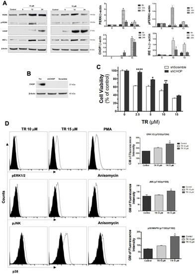 Figure 4. TR Induces ER Stress-Mediated Apoptosis. (A) Expression levels of UPR and ER stress proteins induced by 10 and 15 µM TR incubated with K562 cells for 12 and 24 h. Densitometry bands were quantified and normalized by their respective β-actin bands. Values are expressed as means ± SD. * Statistically different from the control (p < 0.05). (B) CHOP knockdown in K562 cells. CHOP expression was stimulated by 1.0 μg/mL tunicamycin (Tm) in the scramble and shCHOP cells. (C) Effects of increasing TR concentrations on shCHOPK562 cells after 24 h of incubation by MTT. Data are expressed as percentages of viable cells (mean ± SD) calculated considering the control (i.e., without TR) as 100%. * Statistically different from shScramble K562 cells (p < 0.05). (D) Expression levels of phosphorylated JNK and other stress-related signaling molecules ERK1/2 and p38 analysis by flow cytometry in K562 cells incubated with TR for 24 h. * Statistically different from the control (p < 0.05).