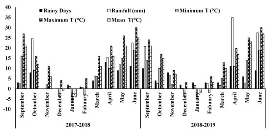 The soil characteristics at the research site comprises a clay loam texture and the soil nutrients status is presented in Table 1. The weather data of both growing seasons (2017–2018 and 2018–2019) is displayed in Figure 1.