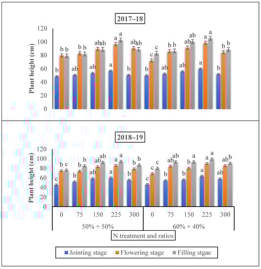 Nitrogen can significantly affect the plant growth and development as a key macronutrient. The findings of our study revealed that the plant height of winter wheat was lowest under the control treatment when compared to different nitrogen treatments and ratios. This is an agreement with previous findings reported by Tanka et al. where in the first winter season, the plant height improved and reached a high of more than 120 cm at the milk ripping period, and in the second winter season, the plant height extended over 100 cm at flowering and 120 cm at the grain filling period [42]. Furthermore, the differences in the two growing season were mainly attributed to the better development of winter wheat in the 2017–2018 growing season, which resulted in the right time of top-dressing application. Our findings were in line with those by Yingkui et al., who noted that the application of different ratios of fertilizer ranging from 70:10:20:0%, 50:10:20:20%, and 30:10:30:30% had a significant effect on winter wheat [43].