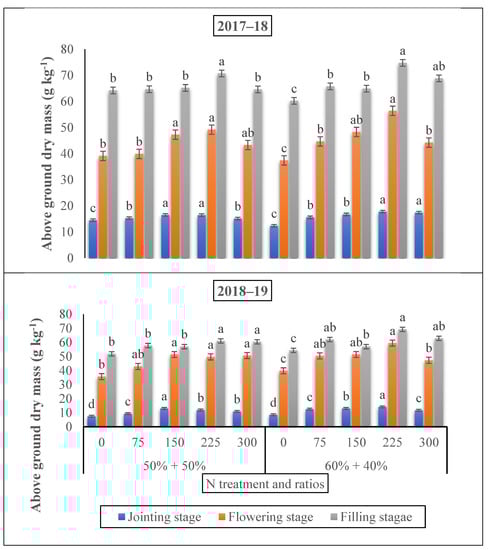 The effect of nitrogen fertilizer application on the aboveground biomass (g kg−1) of winter wheat at various developmental stages. Mean values in a separate column followed by similar letters were not significantly different at p < 0.05. The values are the means ± SE (standard error).