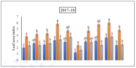 The LAI of wheat plants was determined from jointing to the grain filling stage in two years. Briefly, 15 cm of the wheat plants from the central rows of all plots were destructively collected. To regulate the leaf area of the wheat plants, we distinguished the tall leaf space with a ruler; previously, the leaf area was proposed by increasing the leaf length and the width with a persistence of 0.75 [36], and the proportion of the winter wheat leaf zone to ground zone.