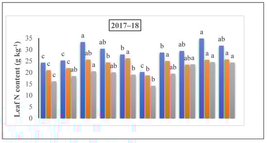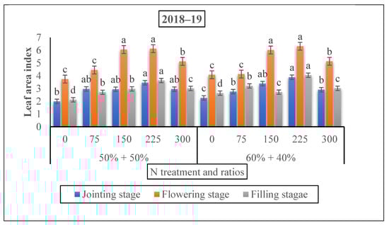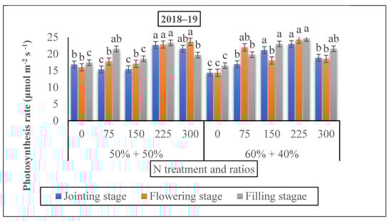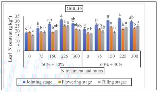 A substantial increment was shown in the leaf N content with the rise in the nitrogen rate (Figure 7). The nitrogen content in the leaves were 43.5% and 47.7% at the jointing stage, 63.5% and 57.3% at the grain filing stage under 60% + 40% ratio, and 37% and 43.5% at the flowering stage under 50% + 50% in the treatment of 225 kg N ha−1 in 2018 and 2019, respectively. The maximum results were observed at the 60% + 40% ratio under the 225 kg N ha−1 treatment at the jointing stage. However, at the flowering stage, the results ranged from 28.70 to 25.63 under the same treatment, but at the ratio of 50% + 50% where nitrogen was applied at the time of the jointing stage. At the filling stage, the results ranged from 26.34 to 28.34 under the same treatment and 60% + 40% ratio, when nitrogen was applied at the flowering stage in both years compared to 150 and 300 kg N kg ha−1, individually (Figure 4).