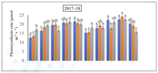 As shown by [38], the photosynthesis rate (Pn) of wheat plants under different growth stages was determined by using the Li-6400 suitable photosynthesis technique (LI-COR Inc. Lincoln, NE USA). From all plots, two winter wheat flag leaves were designated to regulate the photosynthesis rate. The measurements were taken from 10:00 to 11:10 on a strong sunny day below a CO2 concentration of 400-mol mol−1.