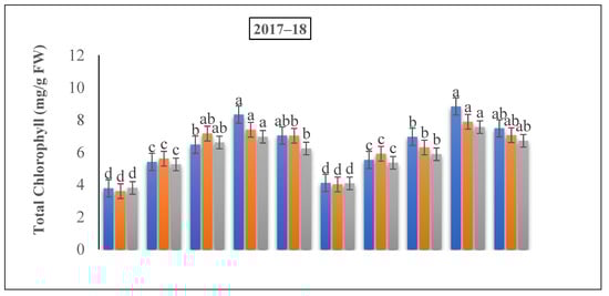 To measure the chlorophyll content, the middle part of the leaves was separated and scratched into minor quantities of 2 mm in thickness. We exactly weighed 0.08 g in a 25 mL volumetric bottle, with an 80% acetone capacity, and placed in a dark environment for 24 h. Chlorophyll a and b were analyzed using an ultraviolet Shimadzu UV-1800 UV (Japan) spectrophotometer at the wavelengths of 665 and 649 nm, respectively [39,40].