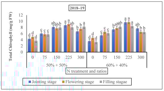 The effect of nitrogen fertilizer application on the total chlorophyll content of winter wheat at various developmental stages. Mean values in a separate column followed by similar letters were not significantly different at p < 0.05. The values are the means ± SE (standard error).