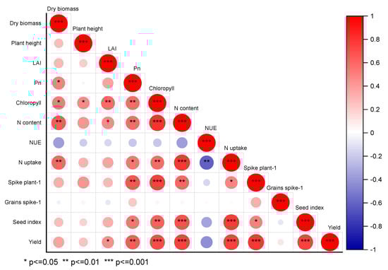 The relationship between the yield and other studied parameters. Red represents a positive correlation, and blue represents a negative correlation (* p ≤ 0.05, ** p ≤ 0.01, *** p ≤ 0.001). The intensity of color represents the significance of a variable. The LAI, Pn, N, and NUE refer to the leaf area index, photosynthesis rate, nitrogen, and nitrogen use efficiency, respectively.
