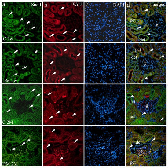 Immunohistochemical expression patterns of Snail (a) and Wnt4 (b) markers in the kidneys of diabetic (DM) and control (C) rat groups at 2 weeks (2w) and 2 months old (2M). Positive cells were observed as cytoplasmic or membrane staining (arrows) through the renal cortex. (c) DAPI nuclear staining. Co-expression of these markers is indicated with arrowheads (d). g—glomerulus, pct—proximal convoluted tubules, dct—distal convoluted tubules. The scale bar is 20 μm, which refers to all images.