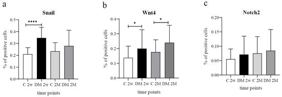 Percentage of Snail (a), Wnt4 (b), and Notch2 (c) positive cells in diabetic (DM) and control (C) rat groups at 2 weeks (2w) and 2 months (2M). Data presented as mean ± SD, unpaired t-test. * p < 0.05, **** p < 0.0001.