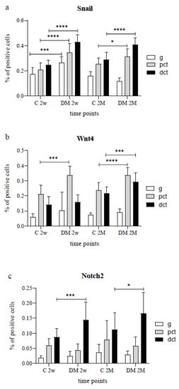 Percentage of Snail (a), Wnt4 (b), and Notch2 (c), positive cells in nephron substructures between diabetic (DM) and control (C) rat groups at the periods of 2 weeks (2w) and 2 months (2M). Data presented as mean ± SD, two-way ANOVA. g—glomerulus, pct—proximal convoluted tubules, dct—distal convoluted tubules. * p < 0.05, *** p < 0.001, **** p < 0.0001.