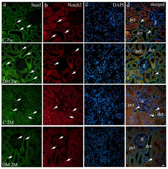 Immunohistochemical expression patterns of Snail (a) and Notch2 (b) markers in the kidneys of diabetic (DM) and control (C) rat groups at 2 weeks (2w) and 2 months old (2M). Positive cells were observed as cytoplasmic or membrane staining (arrows) through the renal cortex. DAPI nuclear staining (c). Co-expression of these markers is indicated with arrowheads (d). g—glomerulus, pct—proximal convoluted tubules, dct—distal convoluted tubules. The scale bar is 20 μm, which refers to all images.