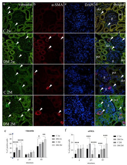 Immunohistochemical expression patterns of vimentin (a) and α-SMA (b) markers in the kidneys of diabetic (DM) and control (C) rat groups at 2 weeks (2w) and 2 months old (2M). DAPI nuclear staining (c). Co-expression of these markers is indicated with arrowheads (d). g–glomerulus, pct–proximal convoluted tubules, dct–distal convoluted tubules. Percentage of vimentin (e) and α-SMA (f) positive cells in kidney cortical structures between diabetic (DM) and control (C) rat groups at the periods of 2 weeks (2w) and 2 months (2M). Data presented as mean ± SD, two-way ANOVA. g—glomerulus, pct—proximal convoluted tubules, dct—distal convoluted tubules. * p < 0.05, ** p < 0.01, *** p < 0.001, **** p < 0.0001. The scale bar is 20 μm, which refers to all images.