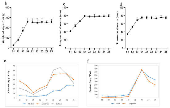 We measured the fruit weight and size at the time of sampling. With the ripening of the fruits, their weight and size also increased, with the weight at stage S4 reaching 260 g. (Figure 1a–d). To analyze the aroma components of Panguxiang fruits at different stages, we determined the volatile substances present in the nine stages of the fruits. These volatiles included alcohols, ketones, aldehydes, esters, and terpenes. The levels of alcohols, ketones, and aldehydes in the nine stages initially decreased with ripening, but increased significantly starting at stage S3. The concentrations of aldehydes and ketones continued to increase throughout the first storage stages, reaching maxima at Z3 and Z4, after which they decreased once more. In contrast, the concentrations of alcohols, although lower than those of the other chemical groups, continued to rise throughout storage. The concentrations of esters and terpenoids remained unchanged throughout the ripening stages, but increased sharply during the first three stages of storage to a maximum at stage Z3 (4265 ng. g−1 and 4394 ng. g−1, respectively), after which they decreased again. At the early stage of storage, from Z1 to Z3, fruit esters and terpenoids rose rapidly; at the later stage of storage, the decrease rate of ester concentrations was slightly slower than that of terpenoid concentrations (Figure 1e,f).
