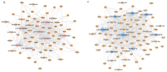 Transcription factors (TFs) are important regulators in plant development [41], and we therefore investigated the distribution of TF genes in all modules (Table S5). Statistical analysis suggested that the prominent TF families present in the yellow module were the AP2/ERF-ERF, C3H, MYB, NAC, C2H2, GRAS, and Trihelix families (Table 2, Table S6).