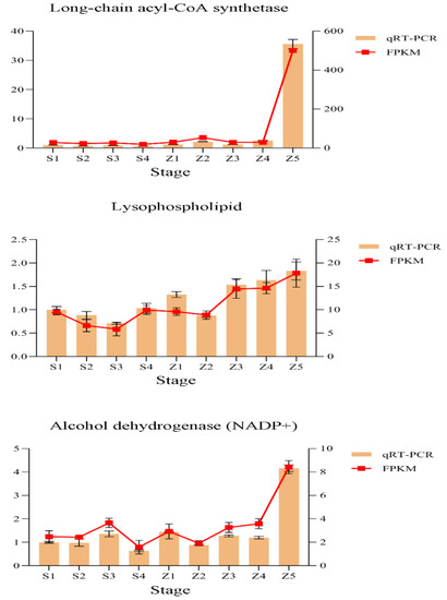 To verify the RNA-Seq data, we used qRT–PCR to analyze the expression levels of three genes involved in the modules from the fatty acid synthesis and metabolism pathways. The gene expression patterns were then compared with the FPKM values. The results showed that the expression patterns suggested by the two analysis techniques were consistent, indicating that our data were reliable (Figure 3 and Table 1).