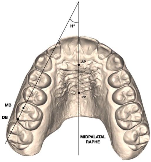 Henry’s angle (H°): angle formed between the midpalatal raphe (AP-PP) and a line passing by the mesial buccal (MB) and distal buccal (DB) cusps of the upper first molar.