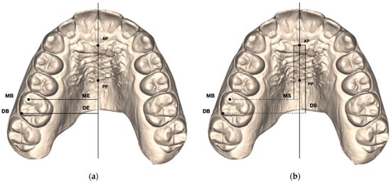 Figure 2. (a) Linear measurements of the expansion movements (ME, DE) of the maxillary first molar mesial buccal (MB) and distal buccal (DB) cusps. (b) Linear measurements of the sagittal movements (MS, DS) of the maxillary first molar mesial buccal (MB) and distal buccal (DB) cusps. - Distal buccal Expansion (DE): linear distance between the distal buccal cusp of the maxillary first permanent molar and midpalatal raphe (AP-PP) measured on each side [11] (Figure 2a);