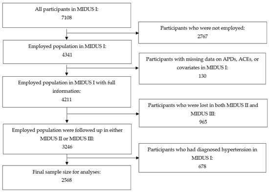 Data for this study were drawn from the MIDUS I, II, and III surveys. The MIDUS surveys were national, population-based cohort studies of psychosocial, behavioral, and health factors in U.S. adults. The MIDUS surveys were conducted via random digit dial (RDD) interviews and a self-administered questionnaire (SAQ). The MIDUS study began in 1995 [22], with follow-up in MIDUS II from 2004 to 2006 [24] and in MIDUS III from 2013 to 2014 [23], culminating in maximally 20 years of follow-up time. At MIDUS I, which was the baseline time-point for the present study, there were 7108 participants, of which 4341 were employed. Among employed participants, 4211 (97%) had full data for variables included in the analyses of the current study. After the two subsequent surveys of MIDUS II and III, there were 3246 participants who were followed up at least once, representing a follow-up rate of 77%. We excluded participants with self-reported physician-diagnosed hypertension at baseline to produce accurate estimates of incident hypertension during follow-up and minimize reverse causation. The process of sample selection yielded a final sample size of 2568 participants (see Figure 1). Follow-up time began upon enrollment in the MIDUS I survey, and censoring based on hypertension incidence occurred between MIDUS I and MIDUS III. We adhered to the Strengthening the Reporting of Observational Studies in Epidemiology (STROBE) guidelines. All participants provided written informed consent. This study was reviewed and approved for exemption by the University of California, Los Angeles Institutional Review Board (IRB#22-000604).