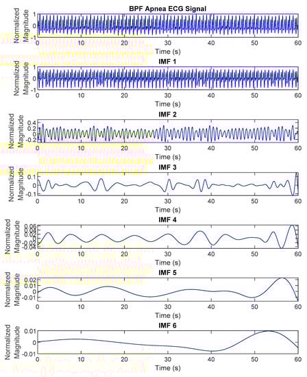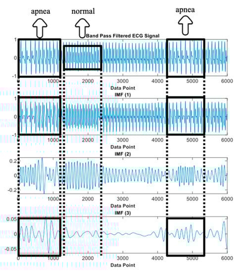 Many studies have described the ECG signal to be highly correlated with respiratory variation [38,56,58,59]. During apnea onset, some key features can particularly be observed on the ECG signal, such as a decline in heart rate and an increase in heart rate followed by the end of the apnea episode. By decomposing the ECG signal using EMD, these key features are enhanced in certain IMFs. EMD deconstructs a signal into its key components (IMFs), which may then be used in evidence-specific dynamics to provide a more complete description of the signal [41,60]. EMD directly extracts energy connected with distinct intrinsic time scales.