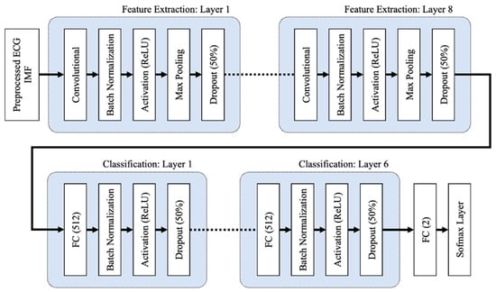To initialize the weights, the CNN and FC layers both use the He normal initialization method. The weights are initialized with the previous layer of neurons in mind, which helps the cost function reach the global minimum faster and more efficiently. The batch normalization layers, which are added after the CNN and FC layers in both the feature extraction and classification layers, normalize the data before it enters the ReLU activation layer, which improves the neural network’s speed, performance, and stability. By selecting the maximum activation about a neuron in a feature map, the max pooling layers in the feature extraction layers reduce network complexity and the possibility of overfitting. When the pooling size is set to 2, the size of each feature map is cut in half. Dropout layers with a dropout rate of 0.5 are used to reduce overfitting by randomly omitting 50% of the nodes during the proposed CNN model’s training process. Overfitting results in a high training accuracy but a low testing accuracy. The proposed 1D deep CNN model was trained to minimize cross entropy using the Adam optimizer, which is a stochastic gradient descent extension that computes individual adaptive learning rates for different parameters based on estimates of the gradient’s first and second moments.