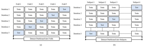 In the kfold-CV (Figure 9a), the first step is to a create division of the data samples randomly into k subgroups. Afterward, each subgroup can be chosen as the testing set with the remaining (k-1) subgroups as the training set. In this manner, kfold-CV repeats training and testing k times, and the final accuracy is the average of the k accuracy values for each iteration. Meanwhile, in the LOSO-CV, the records of only one subject are excluded for each training process. In other words, consider N the number of people in the dataset, training is finished on N-1 subjects and validation is finished on a single subject. This process is repeated N times (Figure 9b).