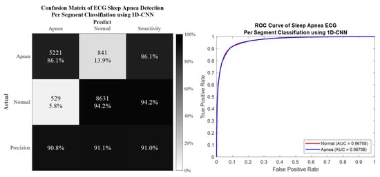 where TP indicates the number of positive events predicted correctly (apnea events predicted as apnea events), FP indicates the number of actual negative events (normal events) predicted as positive events (apnea events), TN indicates the number of negative events predicted correctly (normal events predicted as normal events), FN indicates the number of actual positive events (apnea events) predicted as negative events (normal events). The receiver operating characteristic (ROC) then plotted and computed the area under the ROC curve (AUC) to globally specify the apnea detection performance [51].