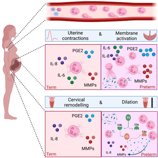 Products of the microbiota can be translocated into the circulation, priming and enhancing neutrophil’s function [108]. The use of peripheral blood neutrophil concentrations as a predictor of preterm birth has been explored in women presenting in threatened preterm labour and PPROM, using the neutrophil-to-lymphocyte ratio (NLR) and total neutrophil counts [109,110]. Several studies show an increase in neutrophil counts and the NLR in women who subsequently deliver preterm [12,111]. Peripheral blood neutrophils exhibit a more activated immunophenotype in women who deliver preterm. Gervasi et al. collected peripheral blood from women who had a healthy pregnancy and subsequent term labour and compared the granulocyte phenotype with women who delivered preterm. Using flow cytometry, they identified that granulocytes expressed higher levels of CD11b, CD15 and CD66 in women who delivered preterm [112]. Similarly, Yuan and colleagues also assessed the mean fluorescence intensity (MFI) of cell surface activation markers and adhesion molecules; CD11a, CD11b, CD62L were more highly expressed in women who delivered preterm compared to term [12]. In vitro assays demonstrate that neutrophils are the leukocytes with the greatest capacity to migrate, and that migration is highest in neutrophils taken from women with PPROM or in preterm labour, compared to women not in labour [113]. This supports priming of neutrophils in the periphery to facilitate migration to gestational tissue as part of the pathological processes of preterm parturition.