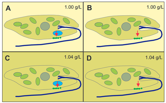 Principles of graviperception, either by means of a distinct gravisensor (here statolith) or the whole cell mass as sedimenting parameter. A statolith (blue) presses (red arrow) onto mechano-sensitive ion channels (A,C) or the whole cell content exerts pressure (red arrow) onto the channels (B,D). When the cells, having a specific weight of 1.04 g/L, are in a lower-density medium (1.00 g/L) (A,B), the pressure will open the channels, and the direction of gravi-stimulus will be detected. When the cells are under isodensity conditions, with respect to the surrounding medium ((C,D), 1.04 g/L), only the pressure of the statolith will be detected, but not that of the whole cell content.