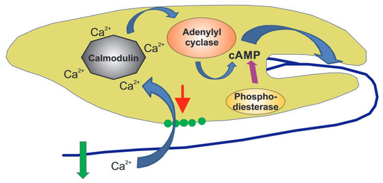 The observations detailed above can be combined into a complex gravitaxis signal transduction chain in this flagellate (Figure 3) [122]. Since the cell content has a higher specific density than the outer medium, it applies pressure onto mechanosensitive TRP channels, which are assumed to be located at the front end, underneath the trailing flagellum, as long as the cell’s long axis deviates from the vertical. Since the cell rotates around its long axis, a modulated signal occurs whenever the flagellum points downwards. The resulting gated calcium influx binds to a specific calmodulin (CaM.2), thereby activating an adenylyl cyclase that produces cAMP from ATP. Shortly after activation, cAMP is broken down by a phosphodiesterase. This transient spike in cAMP controls a specific protein kinase A, located in the flagellum, responsible for the change in movement and course correction. The sensory transduction chains for phototaxis and gravitaxis in E. gracilis seem to converge at the production of cAMP. The involvement of the individual components has been proven by RNAi, as well as specific inhibitors.