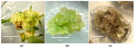 Formation callus on semisolid MS medium supplemented with different concentrations of various auxins (IAA, NAA, and 2,4-D) in combination with 2.0 mg/L BA: (a) 7.5 mg/L IAA; (b) 7.5 mg/L NAA; (c) 5.5 mg/L 2,4-D. Callus after 28 days of culture (the first subculture). Scale bars = 1 cm.