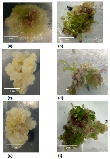 Callus obtained by cultivation on semisolid MS medium supplemented with 2.0 mg/L BA in combination with: (a) FR > R mode, 7.5 mg/L NAA; (b) FR > R mode, 7.5 mg/L IAA; (c) FR = R mode, 7.5 mg/L NAA; (d) FR = R mode, 7.5 mg/L IAA; (e) FR < R mode, 7.5 mg/L NAA; (f) FR < R mode, 7.5 mg/L IAA. Callus after 28 days of culture (the first subculture). Scale bars = 1 cm.