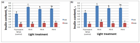 Combined effect of light quality (FR > R, FR = R, FR < R) and plant growth regulators (2.0 mg /L BA in combination with 7.5 mg/L NAA) on inulin content of chicory callus at: (a) Fourth subculture; (b) Fifth subculture. Means (percentage of inulin content) followed by a different letter are significantly different at an alpha level of 0.05 according to the Fisher’s Least Significant Difference (LSD) test. For each treatment n = 150.