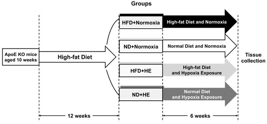 The ApoE KO mice were fed HFD, containing 21% (w/w) fat, 43% (w/w) carbohydrate without sucrose, and 1.5% (w/w) cholesterol, 4.554 kcal/g (Beijing Keao Xieli Feed Co., Ltd., Beijing, China) for 12 weeks. In the food protocol of for the first seven days, a HFD was gradually added into a normal diet until the feeding proportion was totally a HFD. After 12 weeks of the HFD feeding, all ApoE KO mice were forwarded into a six-week interventional experiment and randomly allocated to two groups: normoxia and hypoxia exposure (HE); then they were further divided into HFD and normal diet (ND) groups, respectively (Figure 1). There were four groups: HFD + normoxia, ND + normoxia, HFD + HE, and ND + HE, with six mice in each group (one mouse in the ND + normoxia group was euthanized due to accidental death in the later of intervention). The HFD groups were fed a HFD continuously, while the ND groups were changed to a normal chow containing 4–5% (w/w) fat, 50–60% carbohydrate, and no added cholesterol and sucrose, 3.420 kcal/g (Beijing Huafukang Bioscience Co., Ltd., Beijing, China). WT mice were fed a ND for 18 weeks as a baseline control.