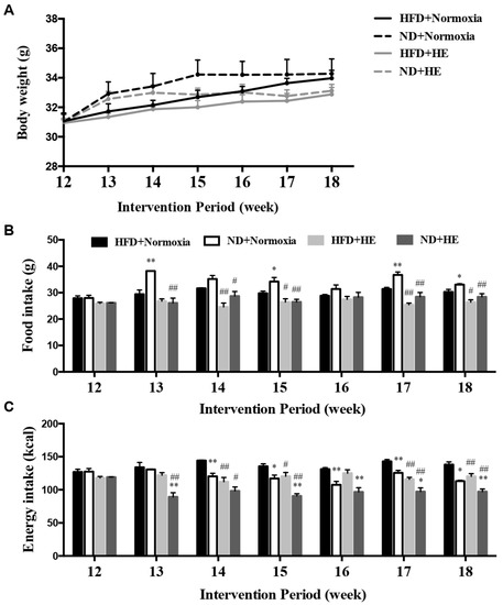 Changes in body weight (A), food (B), and energy (C) intake. * p < 0.05, ** p < 0.01 vs. HFD groups; # p < 0.05, ## p < 0.01 vs. normoxia groups.