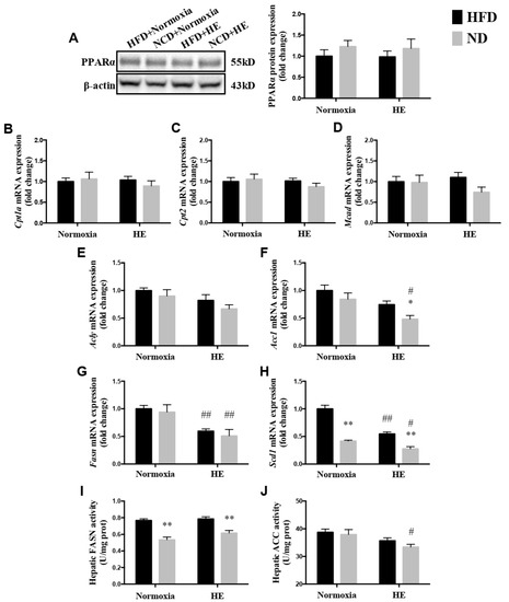 Changes in hepatic PPARα protein expression (A), mRNA expression levels of genes involved in mitochondrial fatty acid oxidation (B–D) and synthesis (E–H), and activities of FASN (I) and ACC (J). * p < 0.05, ** p < 0.01 vs. HFD groups; # p < 0.05, ## p < 0.01 vs. normoxia groups.