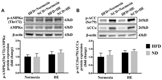 To obtain more molecular evidence of the effects of HE on fatty acid metabolism, the protein expression of p-AMPKα(The172)/AMPKα, p-ACC(Ser79)/ACCα in the liver were measured. Immunoblotting revealed that there was an increasing trend in the hepatic p-AMPKα (The172)/AMPKα and p-ACC(Ser79)/ACCα ratios of the HFD + HE group or ND + HE group compared with the HFD + normoxia group or ND + normoxia group, respectively, but not significant between them (Figure 6A,B).