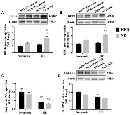There was a significantly lower level of the mRNA expression of Srebp-1c in the liver of HFD + HE mice, than that of the HFD + normoxia group (Figure 7C). Additionally, the protein expression of HIF-1α and DEC1 were higher, and the mRNA expression of Srebp-1c was lower in the liver of the ND + HE group than those of the ND + normoxia group (Figure 7A–C); the protein expression of HIF-1α and DEC1 in the liver of the ND + HE group were higher than those of the HFD + HE group (Figure 7A,B).