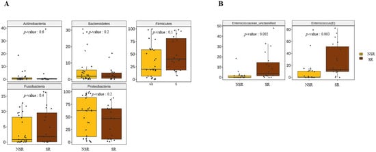 The significances of taxonomic compositional differences were determined using the ANOVA range test and Turkey’s HSD test. At the phylum level, no significant difference was observed between the compositions of microorganisms in the SR and NSR groups (Figure 2A). However, enterococcus and enterococcaceae_unclassified were significantly more abundant at the genus level in SR group. (Figure 2B)