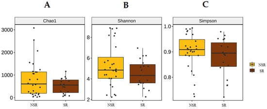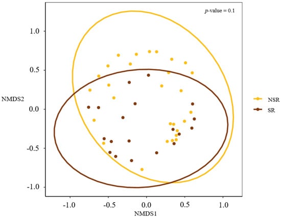 Beta diversity. Non-metric Multidimensional Scaling (NMDS) ordination of beta diversity analyses at the ASV (Amplicon Sequence Variant) level did not exhibit any significant differences between the SR and NSR groups (p = 0.1).